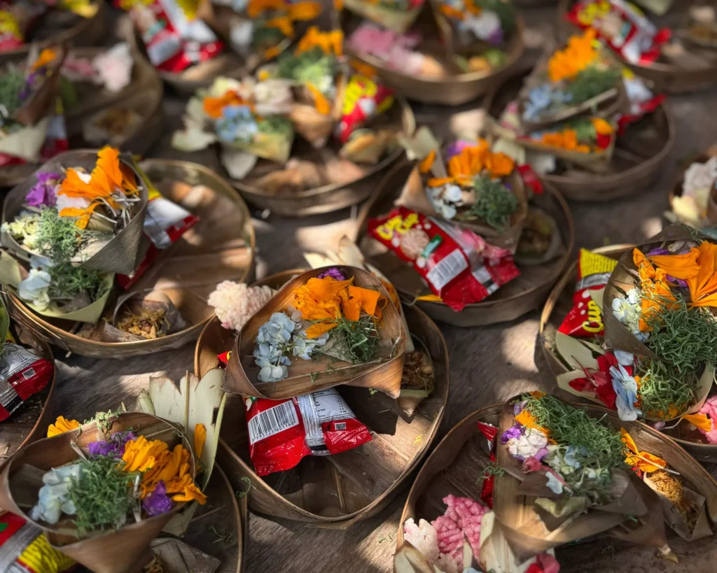 Der balinesische Hinduismus vereint Naturkräfte, Ahnenverehrung und traditionelle Bräuche, er prägt das Leben auf der Insel. Überall werden mit Hingabe kleine Opfergaben vorbereitet, diese sind Ausdruck des tiefen Glaubens und dienen der Beschwörung von Geistern bzw. Göttern.